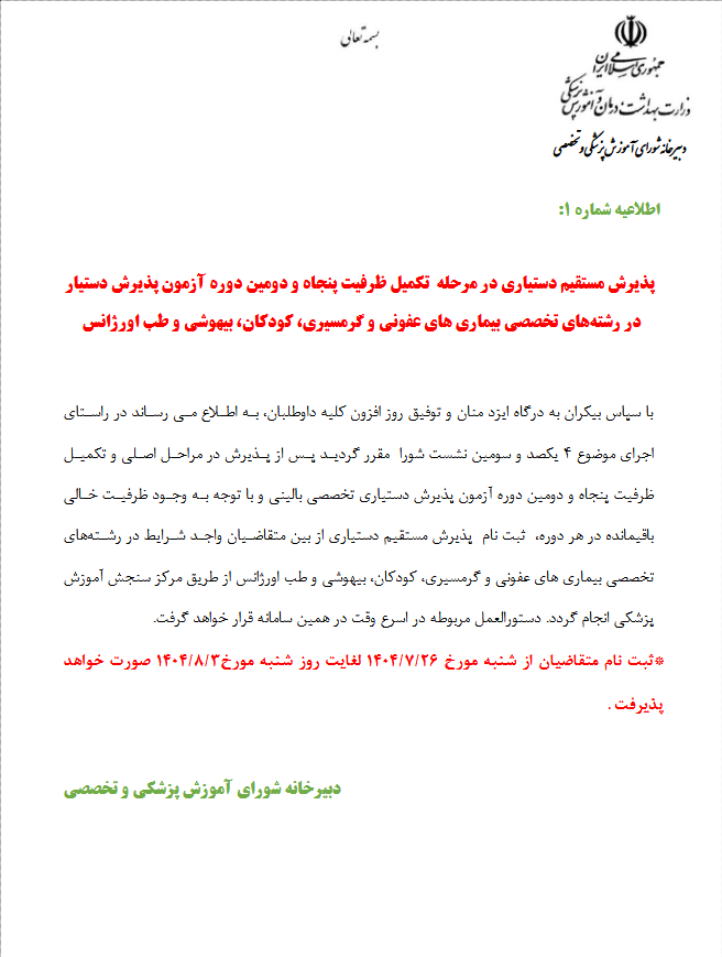 پذیرش مستقیم دستیاری در مرحله تکمیل ظرفیت پنجاه و دومین دوره آزمون پذیرش دستیار در رشته های تخصصی بیماریهای عفونی و گرمسیری،کودکان،بیهوشی و طب اورژانس